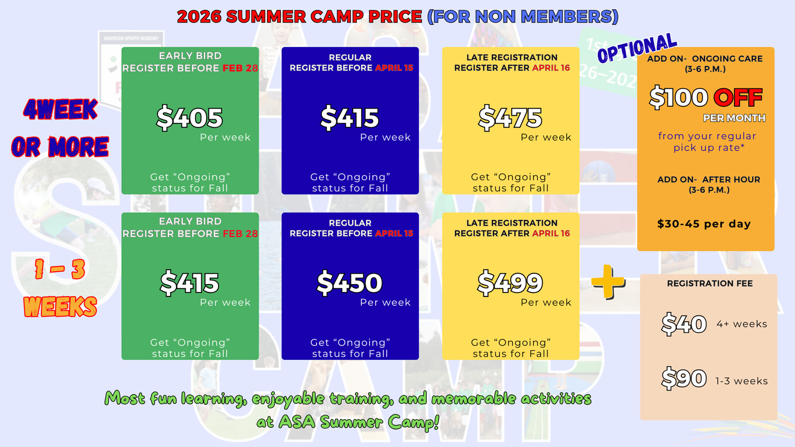 At American Sports Academy Camps, we offer a one-of-a-kind and highly rewarding adventure for students 1st grade and up in the 2026-2027 school year. Our camps are meticulously designed to foster learning, enhance skills in various areas including academics, sports, Taekwondo, music, arts, and language, all while ensuring the utmost fun and excitement.